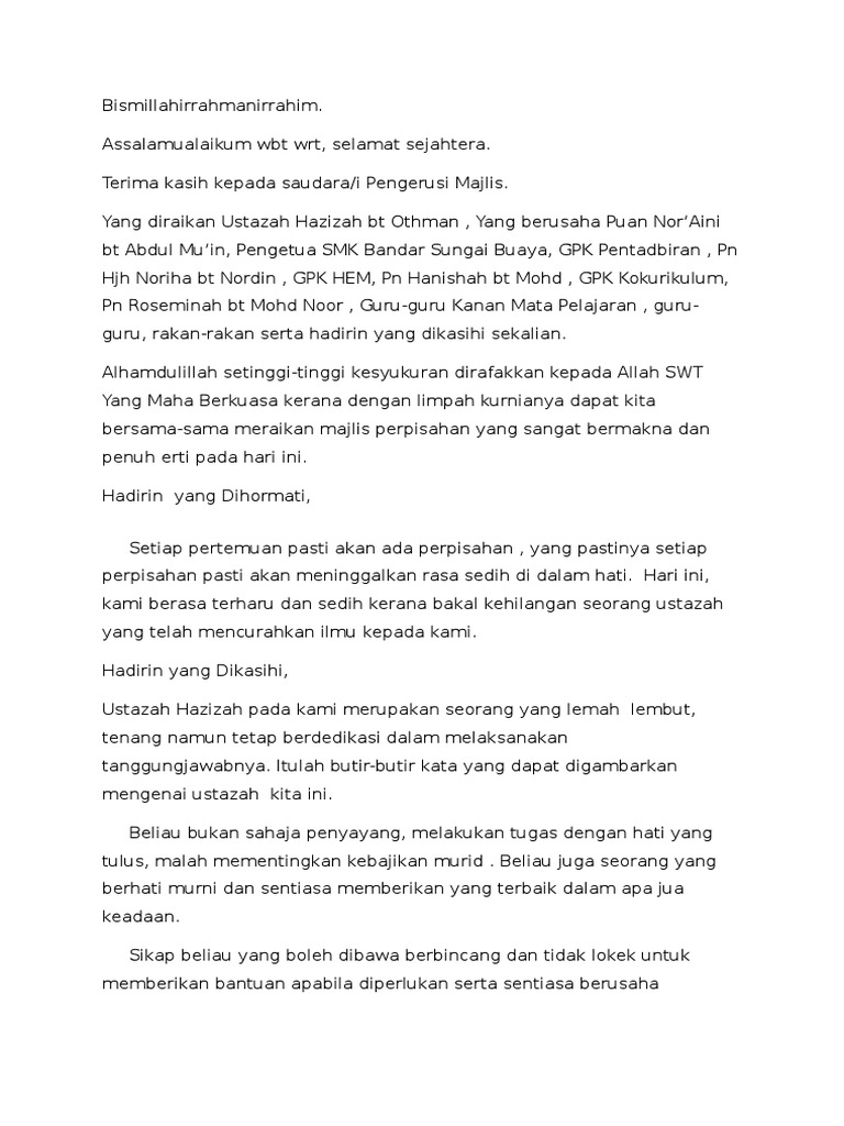 Teks Ucapan Ketua Pengawas Sempena Persaraan Ustazah Hazizah Pdf